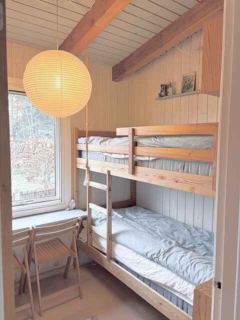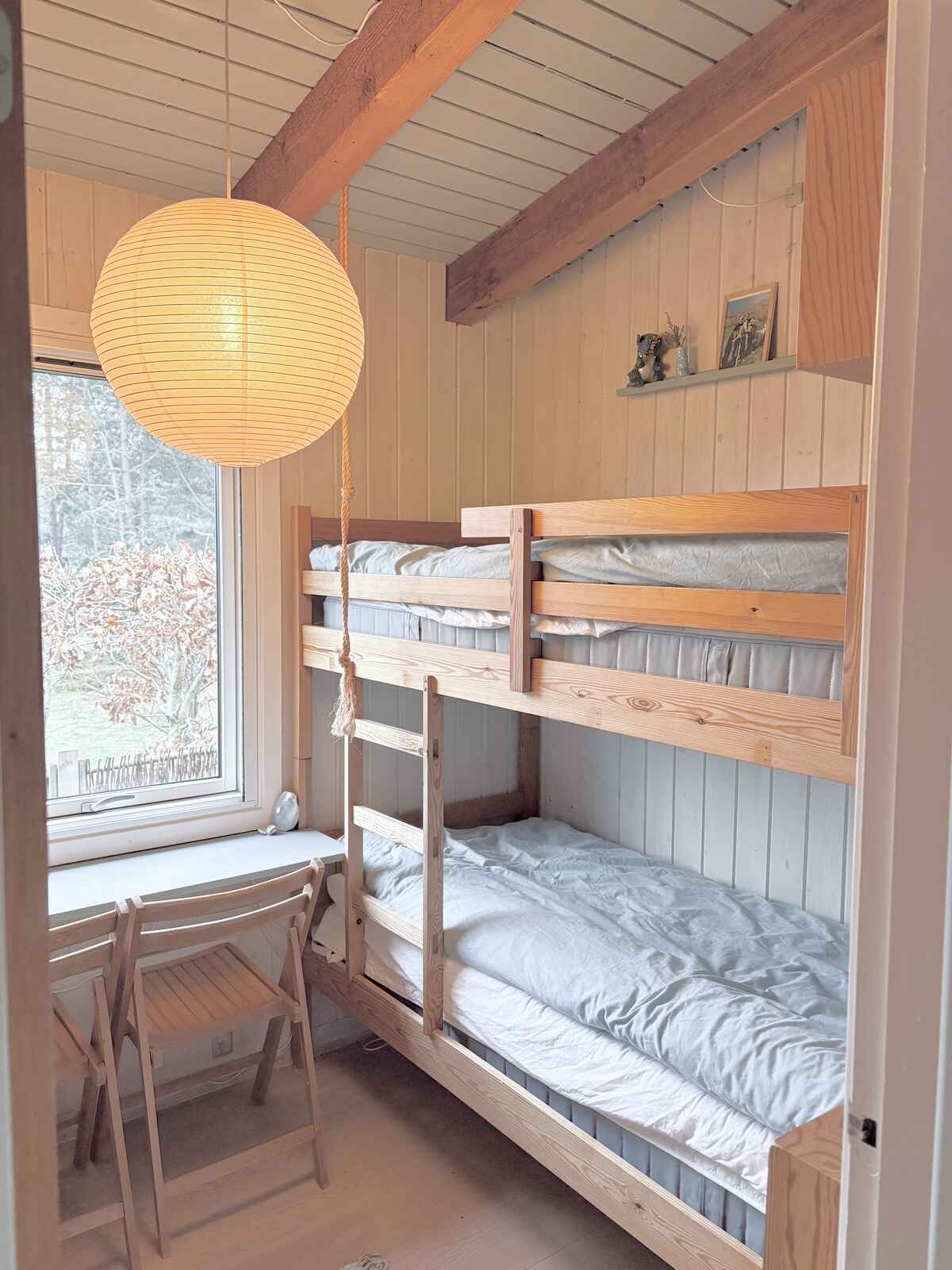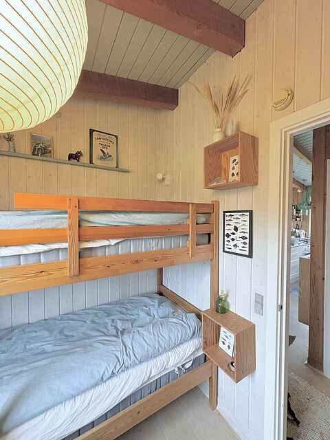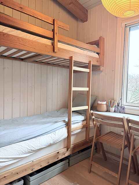 Soveværelse 2 har 4 køjesenge. To er almindelig størrelse; 200×85. De andre to er smalle; 200×60, og primært egnede til børn. Desuden er der en god ekstra madras på 200×85 under en ene køjeseng, som kan trækkes ud og benyttes som ekstra soveplads.