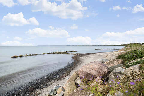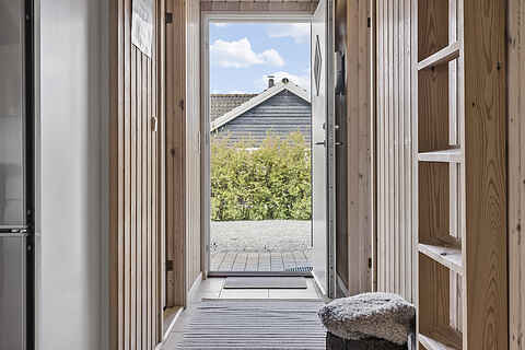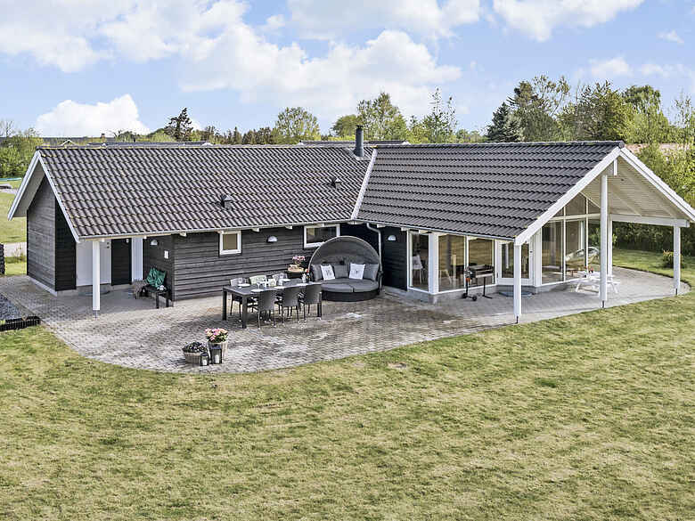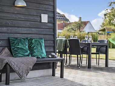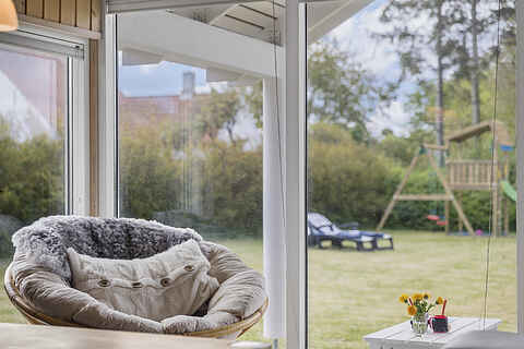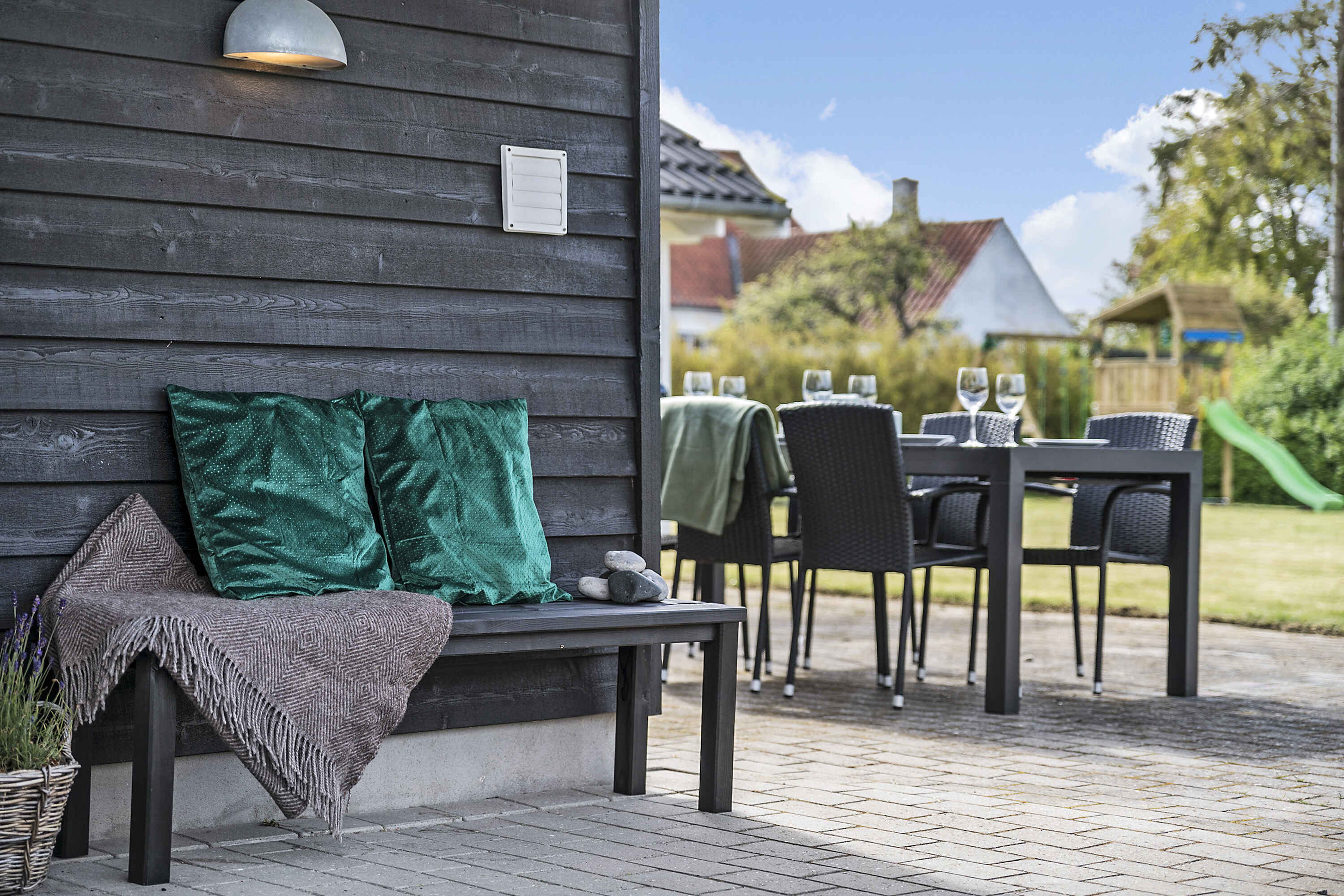 Udenfor er der både en åben og en overdækket terrasse med havemøbler, og her er gynger og sandkasse til børnene. Lige ved siden af huset er der et stort, grønt område, hvor der er plads til leg og boldspil. Ca. 600 meter fra huset ligger den hyggelige Råbylille Strand, hvor I kan bade, soppe, bygge sandslotte eller bare slappe af på stranden.