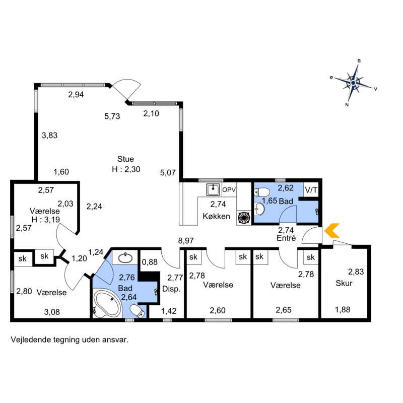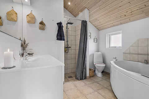 Her er to badeværelser med toilet. Det ene badeværelse er udstyret med en dejlig spa, hvor I f.eks. kan slappe af og få varmen igen efter en rask spadseretur i det friske, danske vejr. Her er både vaskemaskine og tørretumbler.