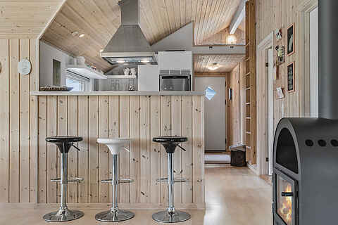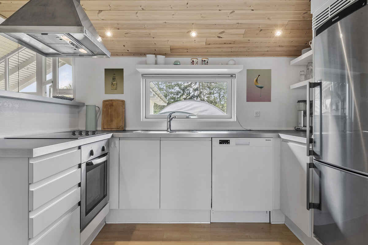 Køkkenet er velindrettet og veludstyret og ligger i åben forbindelse med stuen. Her er selvfølgelig opvaskemaskine. Ved køkkenet er der en bardisk med høje stole, så ”køkkenskriverne” kan være med, når kokken arbejder. Fra køkkenet er der en stige op til hemsen, hvor der er indrettet 2 sovepladser/madrasser til børn.