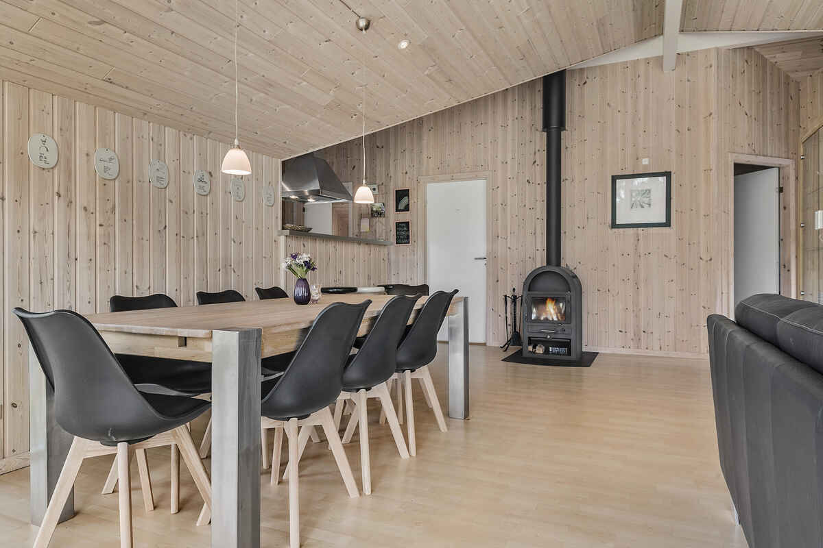 Huset har en hyggelig stue med et flot, stort vinduesparti, der giver masser af lys. Stuen er indrettet med et dejligt sofahjørne, hvorfra I kan nyde udsigten over grunden. Her er brændeovn og TV med Chromecast. Huset har varmepumpe. I stuen er der også et dejligt, stort spisebord med plads til hele selskabet.