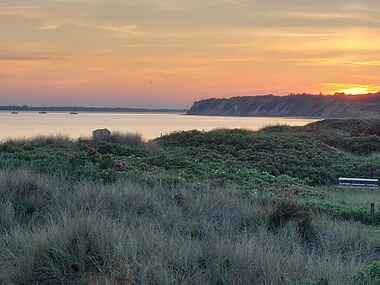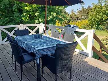 Her kan i sidde på terrassen og nyde aftensolen med et glas hvid eller rosevin kombineret med duft af grill, saltvand og fyretræer sammen med lyden fra bølgeskulp mod strandbredden i baggrunden.