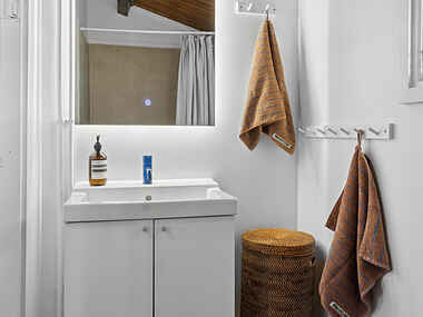 Køkkenet er funktionelt og åbent mod opholdsrummet, så det er nemt at være sammen under madlavning. Der er vaskemaskine, Nespresso kaffemaskine, Internet og musikafspiller i huset. Alle rum har egen adgang til den store terrasse, der løber hele vejen rundt om huset, hvor man altid kan finde læ, sol eller skygge. Et oplagt sted at nyde morgenkaffen, slappe af og samles til fælles måltider under åben himmel. Der er ligeledes mulighed for at rykke terrassemøblerne ind under den overdækkede del, så man kan opholde sig undedørs i alt slags vejr.