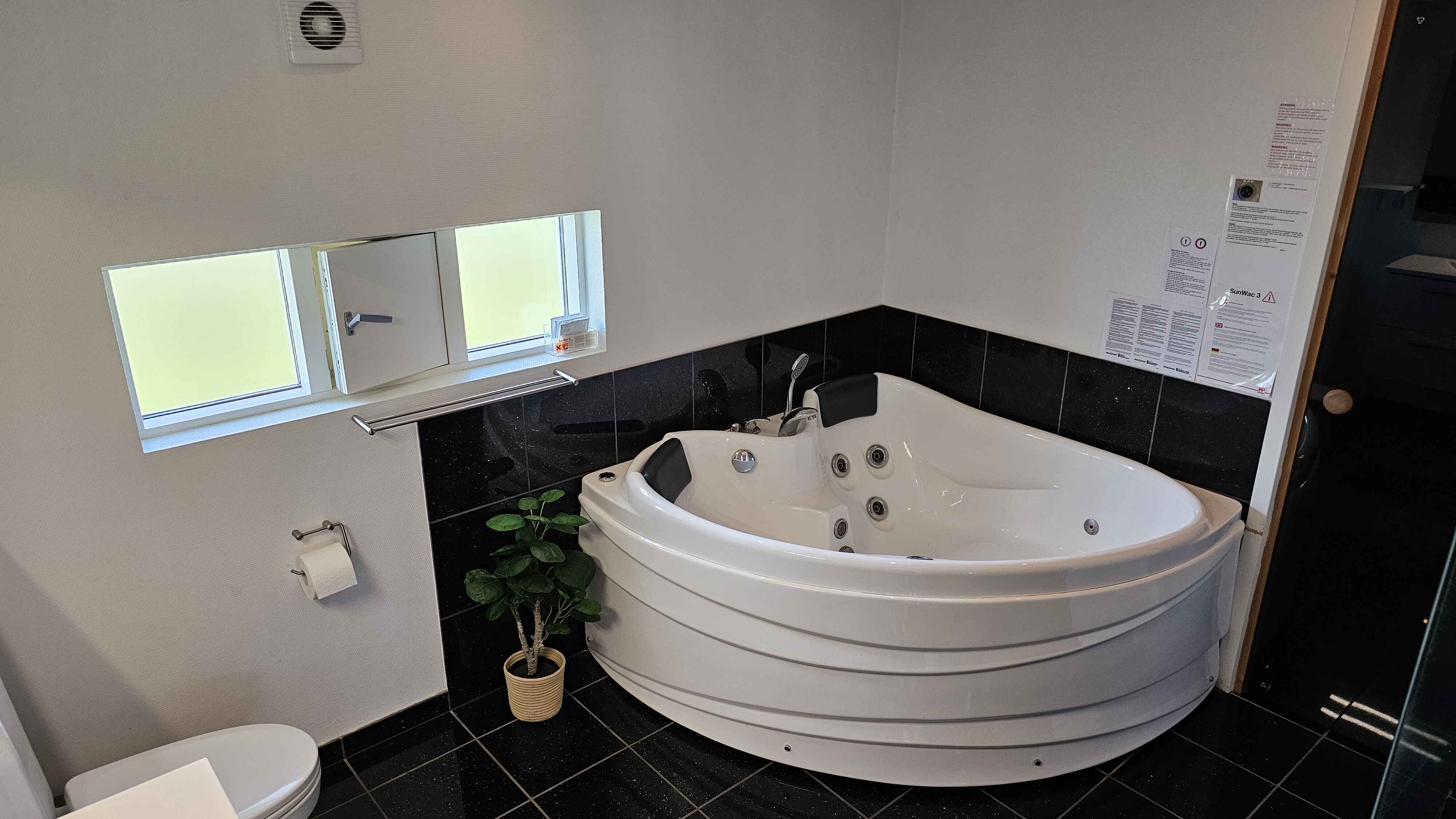 Der er to badeværelser med bruseniche, hvoraf et også har et lækkert spabad til to personer og direkte adgang til husets sauna.
