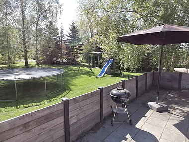 Udenfor kan du slappe af på den skønne terrasse, indrettet med elegante havemøbler. Børnene kan udfolde sig på trampolinen eller lege i det charmerende legehus, der er udstyret med gynger og rutsjebane.