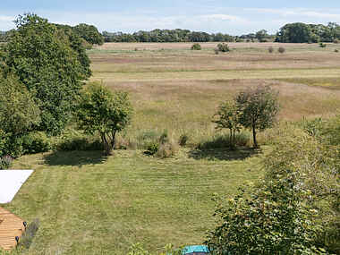 Stuen er husets samlingspunkt med brændeovn og god plads omkring spisebord og sofa. Store, høje vinduer giver et flot lysindfald og åbner for udsigten til den fredede eng. Køkkenet er funktionelt og integreret i opholdsrummet, så man nemt kan være sammen – også mens maden tilberedes.