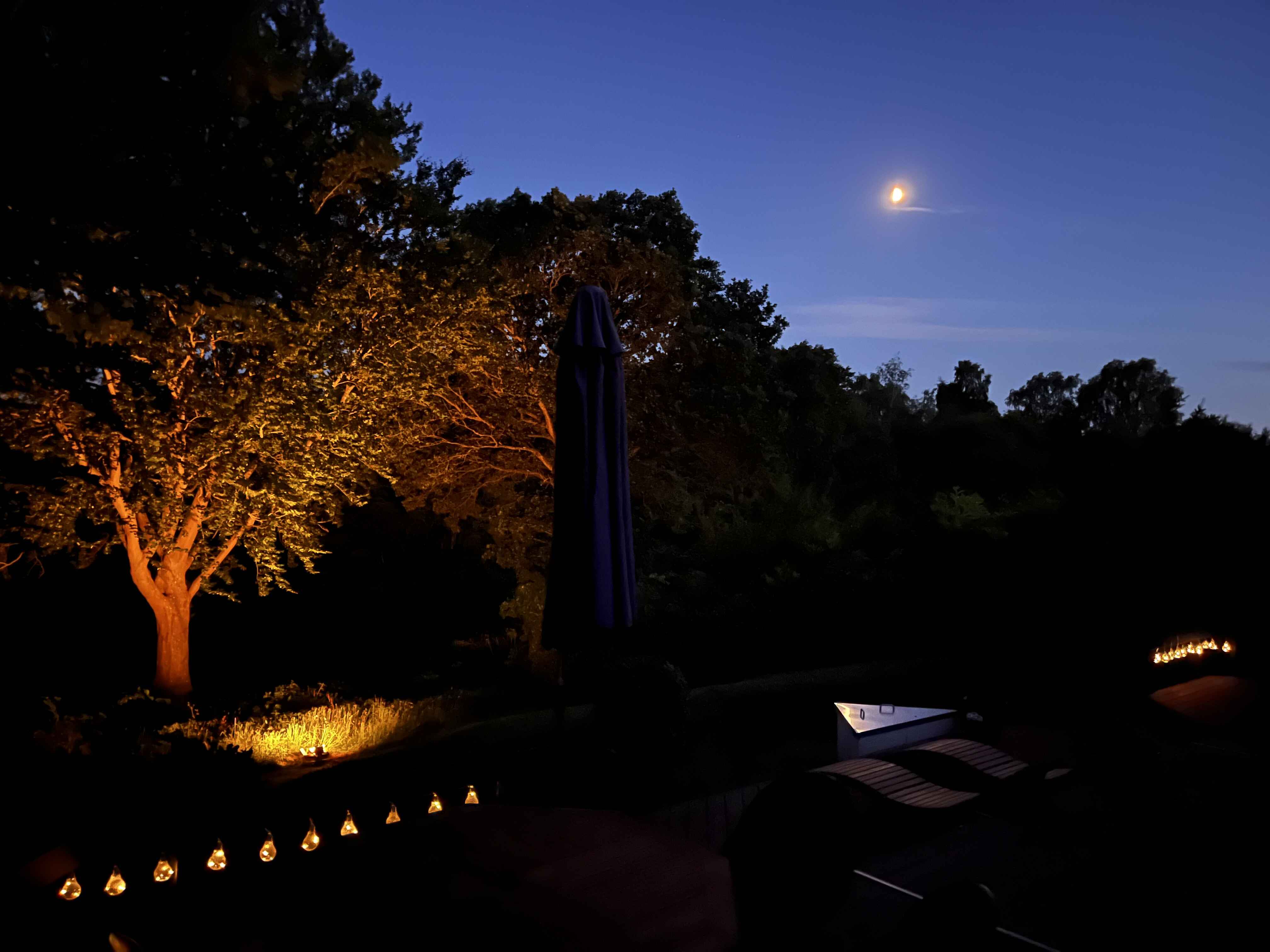Huset ligger fredeligt og ugeneret for enden af stikvej og er med træer og beplantning yderst afskærmet fra tilstødende nabogrunde. Fra den store sydvendte terrasse er der uspoleret og langstrakt udsyn over totaltfredet moseområde, skov og sø. I samme retning er der fri passage til solens bane, hvilket gør huset særdeles solrigt.