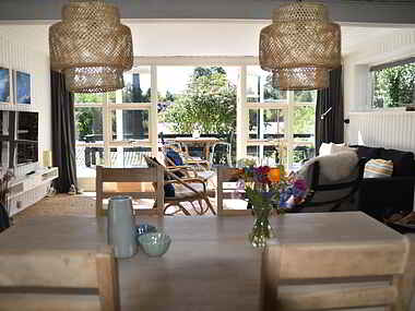 Huset er godt og højt placeret og fra den sydvest vendte del af terrassen har man et kig til en lille sø med et rigt fugleliv. Der er desuden terrasser hele vejen rundt om huset og i forbindelse hermed findes et hyggeligt overdækket område. Man kan derfor selv vælge om man vil sidde i skyggen eller nyde solen hele dagen. Hele den øverste del af grunden er indhegnet.