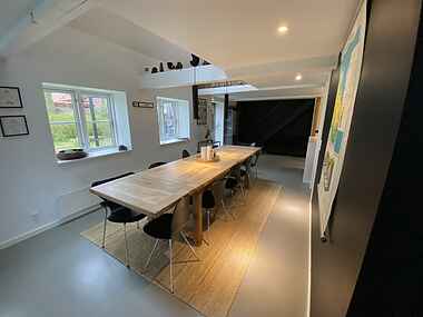 Udenfor venter der jer en meget lækker og moderne træterrasse med spiseplads, helt perfekt til at nyde de varme sommeraftener og hyggelige sammenkomster.