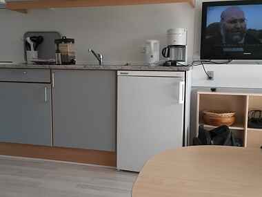 Det hyggelige opholdsområde er centrum for huset, hvor man kan samles om aftenen til spil, samtaler eller blot nyde en god film sammen. Køkkenet er fuldt udstyret og indbyder til at lave lækre måltider med lokale råvarer.