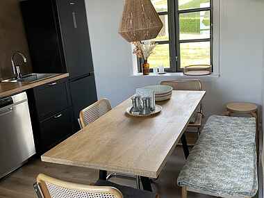 Udebadet og badeværelset sikrer, at alle kan friske sig op efter en dag på stranden, mens det veludstyrede køkken giver dig mulighed for at tilberede lækre måltider og skabe hyggelige stunder omkring spisebordet. Og lad os ikke glemme opvaskemaskinen, der gør opvasken til en leg, så du kan bruge mere tid på det, der virkelig betyder noget – at nyde ferien.