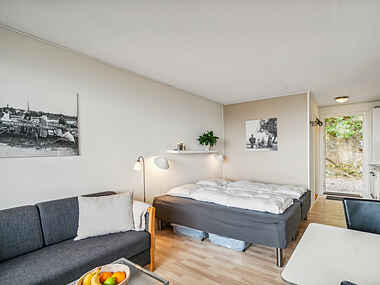 Lejligheden er designet med tanke på komfort og funktionalitet og har plads til op til fire personer. Den er perfekt til en lille familie, der ønsker at tilbringe tid sammen i naturskønne omgivelser. Indretningen omfatter en hyggelig stue med en komfortabel sovesofa, der rummer to sovepladser, samt yderligere to sovepladser, hvilket skaber en hyggelig og intim atmosfære.
