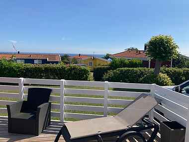 Den rummelige terrasse, der strækker sig langs den ene side af huset, indbyder til afslappede øjeblikke i solens varme stråler, både morgen og aften, og skaber den perfekte ramme for udendørs samvær og hygge.