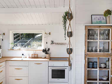 Sommerhuset er lyst med trægulve. Stue og køkken i et.