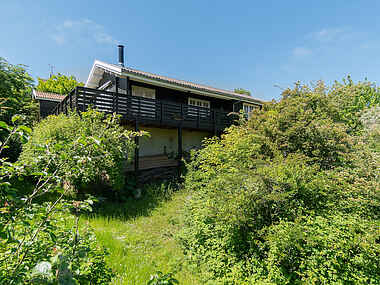 Dit sommerhus hviler majestætisk på grunden, der fremstår som en frodig naturhave med dramatiske klippefremspring, frugttræer og små fortryllende stier.