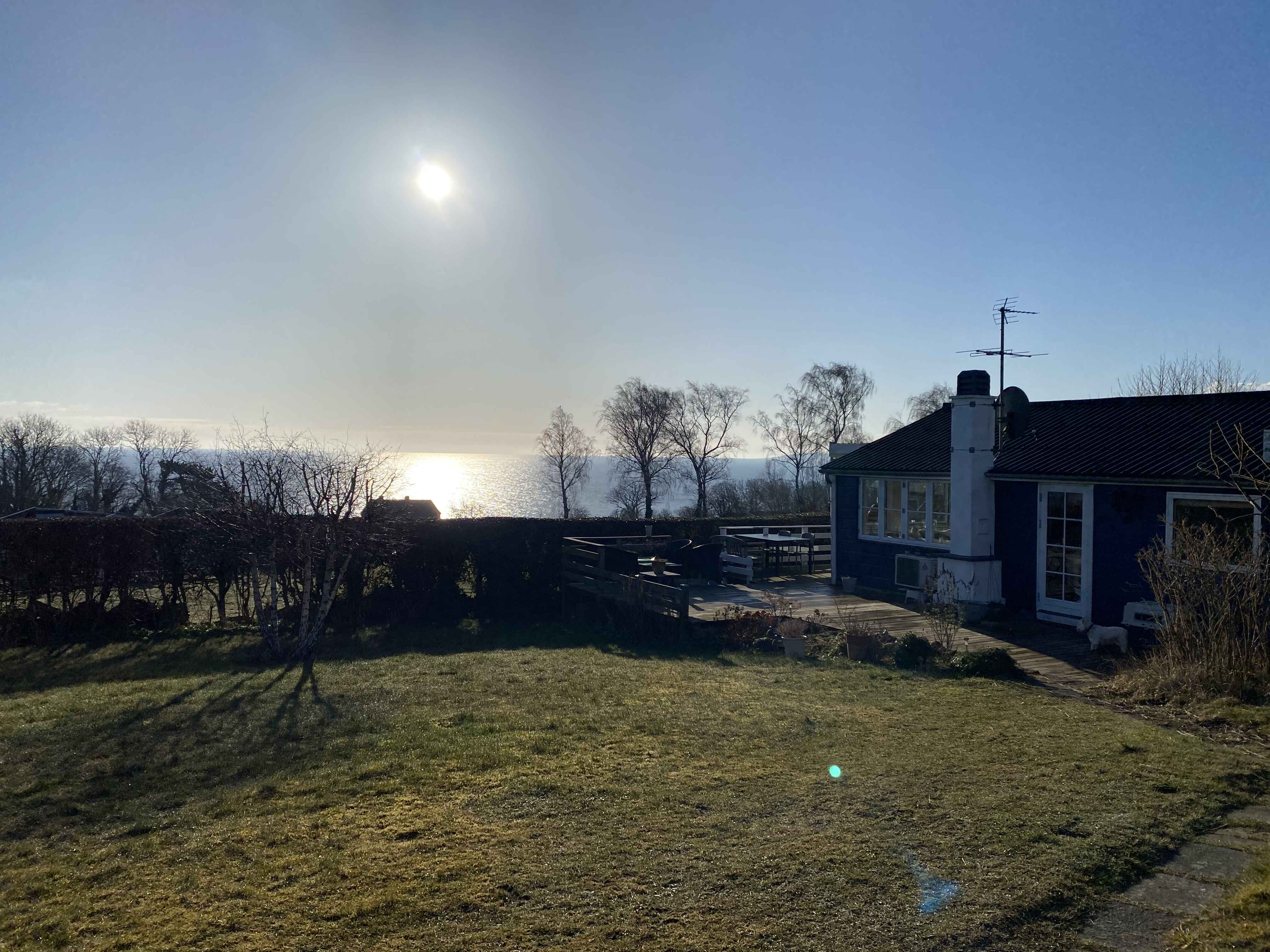 Grundens placering for enden af en malerisk sidevej byder på en smuk havudsigt. En velplejet have med græsplæner og charmerende træterrasser danner rammen om solrige oaser. Du kan trække dig ind under den dejlige overdækning om aftenen og lade den betagende udsigt under tagen fortrylle dig.