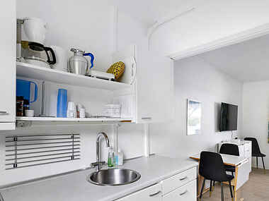 Lejligheden er designet til praktisk komfort til op til 4 personer. Der er soveplads og en sovesofa med opbevaringsmuligheder, et skab, spisebord og en kommode fyldt med spil og bøger til fri afbenyttelse. Der er også en smart TV med chromecast, radio og hurtigt fibernet/internet.