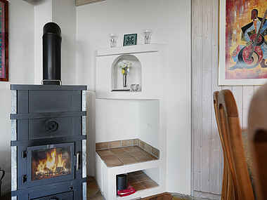 Køkkenet byder på en hyggelig spisekrog, hvor du kan lade dig betage af udsigten, mens du nyder din morgenmad. I opholdsstuen er der en indbydende sofagruppe og en komfortabel lænestol, der inviterer til afslapning. Et stort spisebord giver dig mulighed for at samle dine nærmeste til hyggelige måltider.