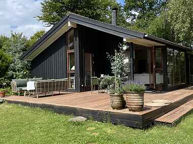 Selve sommerhuset er personligt og hyggeligt indrettet med en varm og indbydende atmosfære. Det er udstyret med alt, hvad der behøves for et komfortabelt ophold. Panoramavinduerne giver en uforstyrret udsigt til søen, hvilket gør det muligt at nyde naturen, selv når man er indenfor. I kan sidde i stuen og lade blikket glide over vandet, mens solens stråler danser på overfladen, eller I kan observere det rige dyreliv fra første parket.