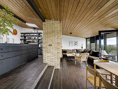 Køkkenet er dejligt stort og funktionelt med bl.a. røremaskine, blænder, stavblænder og Nespressomaskine (medbring selv kapsler). I direkte forlængelse af køkkenet er et spiseområde samt hyggelig stue med stor komfortabel sofa med plads til hele familien, TV og pejs. Herfra kan I nyde den mest fantastiske havudsigt – perfekt sted til at koble af med en god bog, brætspil og timevis af hyggelige snakke.