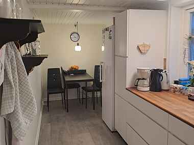 Den åbne stue skaber et hyggeligt samlingspunkt med brændeovn og varmepumpe, der sikrer komfort året rundt. Internet gør det nemt at være online, hvis det ønskes.