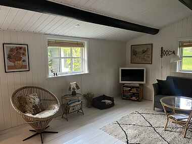 Huset består af en stor stue, køkken, badeværelse og soveværelse. Det andet soveværelse er annekset som ligger vinkelret med huset. Der er to sengepladser i soveværelset i en lille dobbelt seng og 2 sengepladser i stuen, hvor der er en stor og god sovesofa. I annekset er der også 2 sengepladser i alm. dobbeltseng og en sovestol, der kan foldes ud til madras og kan placeres, hvor i huset man ønsker det. Derudover står der en gæsteseng i skuret. Der er ikke døre i hovedhuset på nær til toilettet. Soveværelset adskilles af et tykt velourgardin, og entre og køkken kan adskilles af et bambus dørforhæng.
