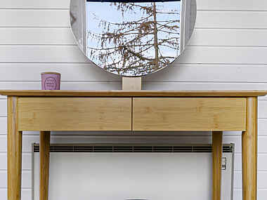 Huset består af en stor stue, køkken, badeværelse og soveværelse. Det andet soveværelse er annekset som ligger vinkelret med huset. Der er to sengepladser i soveværelset i en lille dobbelt seng og 2 sengepladser i stuen, hvor der er en stor og god sovesofa. I annekset er der også 2 sengepladser i alm. dobbeltseng og en sovestol, der kan foldes ud til madras og kan placeres, hvor i huset man ønsker det. Derudover står der en gæsteseng i skuret. Der er ikke døre i hovedhuset på nær til toilettet. Soveværelset adskilles af et tykt velourgardin, og entre og køkken kan adskilles af et bambus dørforhæng.