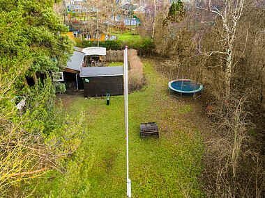 Huset har overdækket terrasse med varmelampe i en lille atrium have, hvor man er helt ugeneret. Selve grunden er 1200 kvm, så der er en stor have rundt om huset, hvor der er en stor trampolin og masser af plads til leg. I skuret kan I finde forskellige legeting og på terrassen står et bordfodboldspil. Der er også bålfad til aftenhyggen.