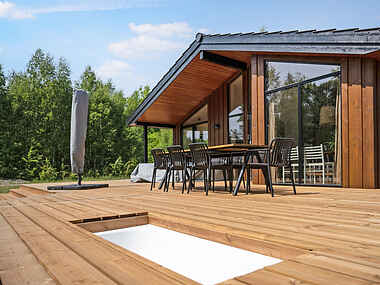Sommerhuset rummer en stor træterrasse, der indbyder til sommerhygge i loungesofaen, hyggelige stunder på den store trappe, eller en spaoplevelse i det integrerede badekar, som både kan fyldes med varmt og koldt vand fra udendørsbruseren. På terrassen finder I også en gasgrill, som frit kan benyttes.