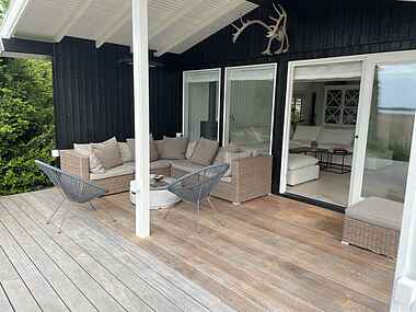 På de solrige dage kan I sætte jer til rette på den store, skønne terrasse. Hele tiden har I den fantastiske udsigt til søen, som ligger kun 100 meter fra huset, både når I samles om grillretterne eller læner jer tilbage i spabadet. Spabadet er åben i perioden maj-september