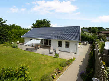 Den fortryllende stue flyder naturligt fra det veludstyrede køkken og byder på en herlig spiseplads. Huset rummer tre generøse soveværelser med i alt plads til seks drømmende sjæle. Fra både køkkenet og stuen er der direkte adgang til en solbeskinnet træterrasse og en indbydende grøn plæne.