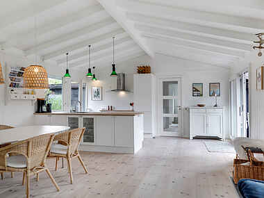 Det åbne køkken indbyder til fællesmadlavning og snakke henover bordet, hvor det er oplagt at samles over et brætspil med en god flaske vin ved hånden. Fra det store opholdsrum er der adgang til lys fordelingsgang, hvorfra der er adgang til 3 soveværelser med skabsplads eller kommode, badeværelse med bruser, toilet og gulvvarme. Der er i alt plads til 6 personer i sommerhuset fordelt på 2 dobbeltsenge og 2 enkeltsenge.
