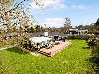 De varme dage kan tilbringes på husets skønne terrasse og på de køligere dage kan man trække sig tilbage i udestuen eller tænde op i pejsen, som er centreret midt i huset. Køkken, spisestue og stue er placeret i et stort opholdsrum, som fremstår stort og lyst. Herfra er der direkte udgang til terrassen, hvor der både er spisebord, grill, liggestole og solen kan nydes hele dagen.