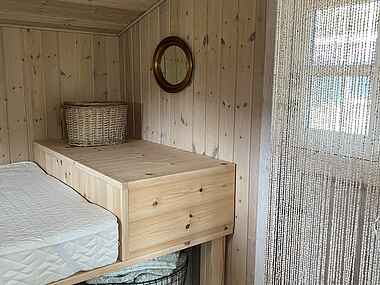 Husets hjerte er det åbne køkken-alrum, hvor der er plads til at familien kan samles om forskellige aktiviteter. Her er en langbænk til hyggelige stunder, et stort soveværelse, og et lille soveværelse med direkte adgang til haven. Annekset rummer 4 køjesengepladser og vender ud mod gårdspladsen.
