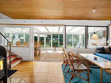 • stue med briks/sovesofa, brændeovn og åbent køkken
