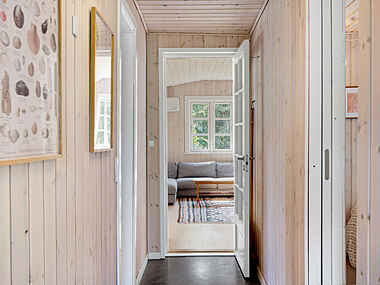 Huset indeholder køkkenalrum/sofastue og tre værelser. I hver af de to værelser er der to sovepladser, mens der i det tredje er en enkeltseng, der kan trækkes ud til en dobbeltseng i hele værelsets bredde.