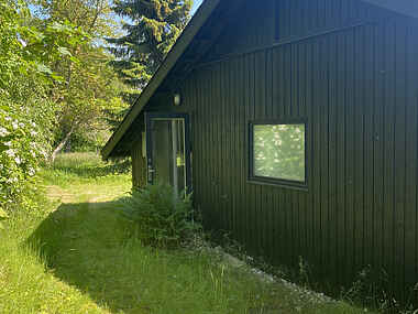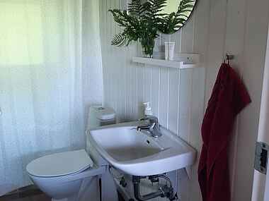 Sommerhusets badeværelse er pænt og funktionelt, udstyret med en bruseniche, så du kan starte dagen frisk og veludhvilet. Fra det åbne køkken alrum er der direkte adgang til en sydvendt og rummelig træterrasse. Her kan du nyde din morgenkaffe eller aftensmad med udsigt over trætoppe og hustage, hvilket skaber en fredfyldt og naturskøn baggrund for dine feriedage.