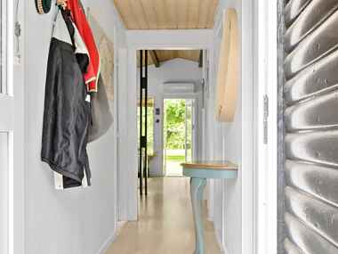 Sommerhuset præsenterer en charmerende indendørs atmosfære med en indbydende entré, der fører til en hyggelig stue, smukt indrettet med en spiseplads og en varmende brændeovn. I stuen er der Tv med Chromecast, så du kan caste dine egne apps til tv-skærmen.