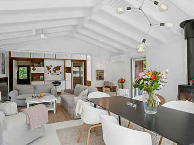 Huset har en åben og behagelig indretning i moderne stil med brug af naturmaterialer og gode indfaldsvinkler til sollyset. Opholdsrummet er et hyggeligt sted at samles om måltiderne, spilaftener eller et glas rødvin, mens I kan kigge ud til haven.