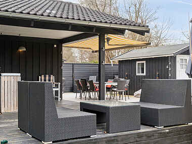 Udenfor venter et stort terrassemiljø med flytbare sidde- og liggemuligheder samt markise til skygge. Haven er indhegnet, med stor græsplæne, nedgravet trampolin og plads til leg.