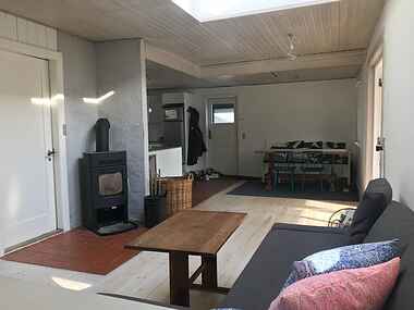 Indenfor sørger brændeovnen og varmepumpen for komfort året rundt. Gæstetoilettet giver ekstra bekvemmelighed, og internet gør det nemt at være forbundet, hvis det ønskes.