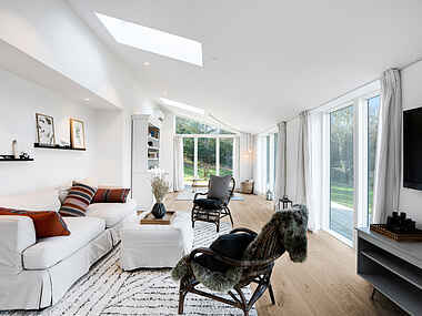 Det indbydende køkken er det perfekte sted at udfolde dine madlavningsfærdigheder sammen med familien. Den rummelige stue fungerer som en fantastisk udsigtspost, hvor terrassedørene åbner op og bringer naturen indenfor. Her forenes indendørs og udendørs rum, hvilket gør det muligt at nyde de betagende solnedgange både inde og ude.