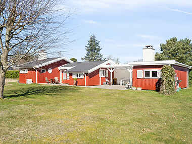 Huset ligger roligt og helt ugenert. Overdækket terrasse med udepejs og to andre terrasser, børnelegehus og tre soveværelser.