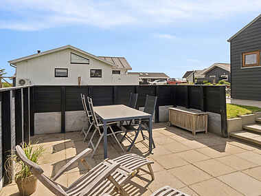 Huset har en lukket gårdhave og tre terrasser. Udekøkken med luksusgrill og udendørsbruser med varmt og koldt vand giver ekstra komfort i sommervarmen.