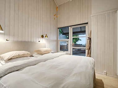 Indendørs byder sommerhuset på en indbydende atmosfære med tre komfortable soveværelser – to med dobbeltsenge og et med enkeltseng – samt en rummelig hems med to ekstra sovepladser. Den store, lyse stue imponerer med sin loftshøjde og store vinduespartier, der åbner op for den betagende udsigt.