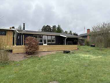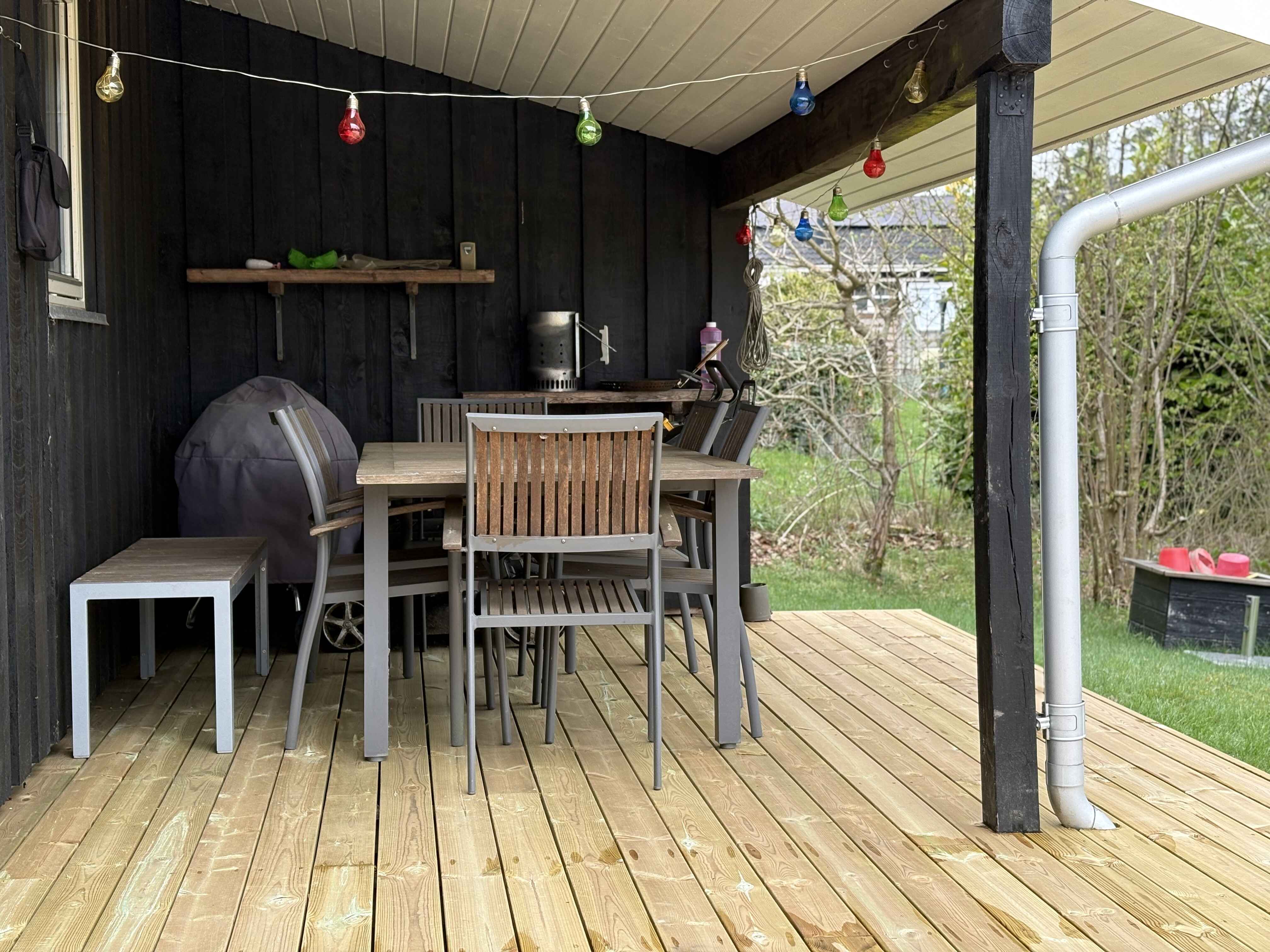 Til ferieboligen hører et stort, åbent terrasseareal med udsigt til mark/skov, som giver mulighed for at nyde solen og måltiderne udendørs. Desuden er der en god overdækket terrasse.