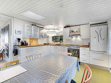 Sommerhuset er komfortabelt indrettet og energivenligt med solceller, varmepumpe og brændeovn (brænde købes på øen, fx på Boagervej 1A). Veludstyret spisekøkken med køleskab og fryser.