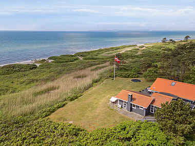 Huset præsenterer sig i en flot blå farve, som smelter smukt sammen med de omkringliggende naturskønne omgivelser. De store panoramavinduer og de rummelige terrasseområder inviterer gæsterne til at nyde den smukke udsigt over havet og de omkringliggende landskaber. Fra terrassen har man desuden overblik over legeområder, hvor gynger, trampolin, sandkasse og forskellige spil giver optimale muligheder for at alle generationer kan hygge sig.