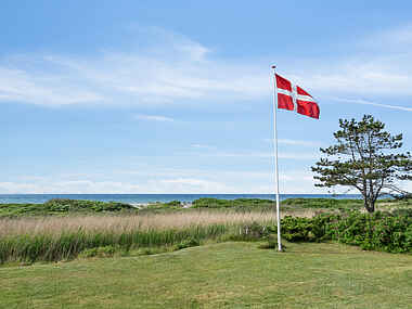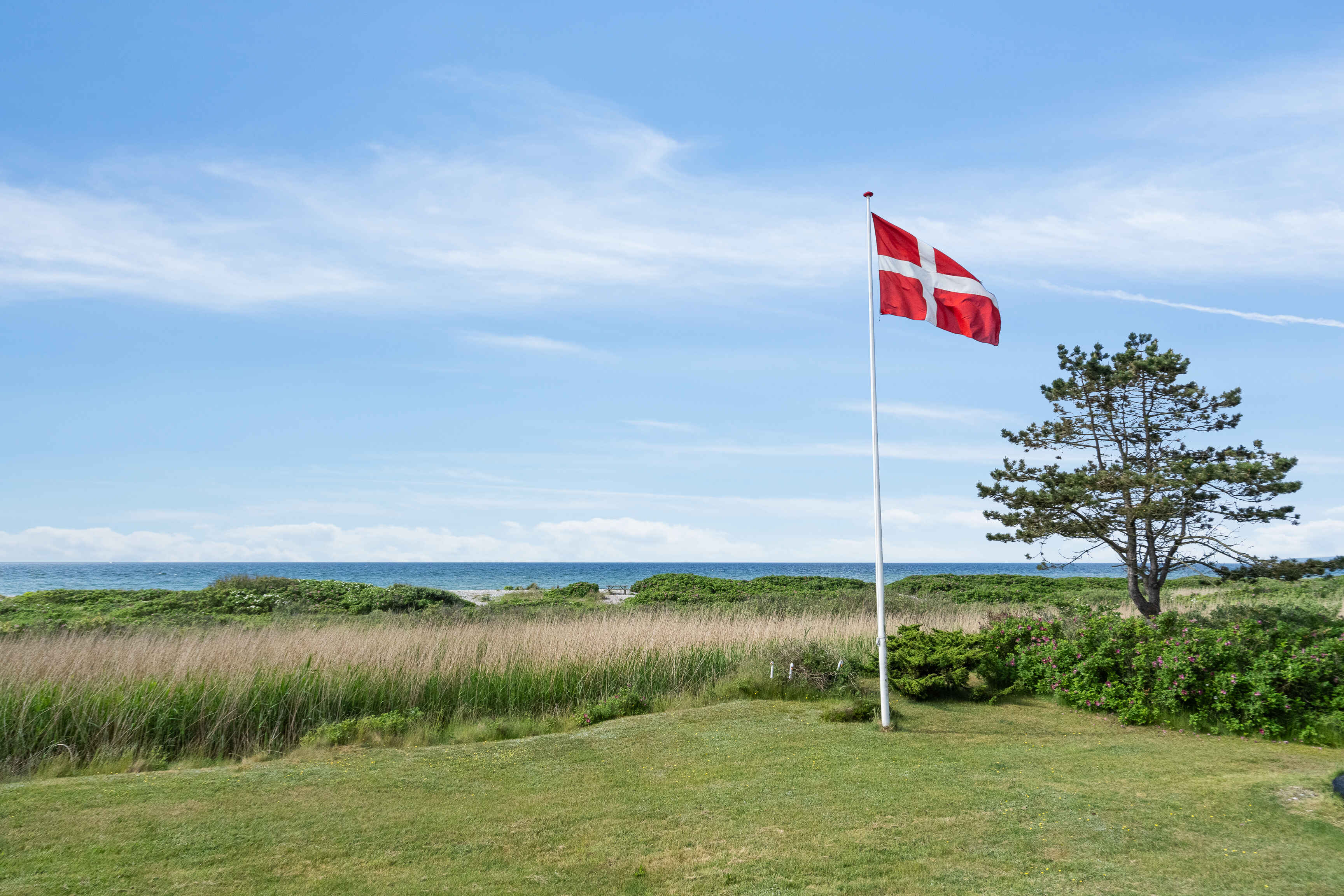 Huset præsenterer sig i en flot blå farve, som smelter smukt sammen med de omkringliggende naturskønne omgivelser. De store panoramavinduer og de rummelige terrasseområder inviterer gæsterne til at nyde den smukke udsigt over havet og de omkringliggende landskaber. Fra terrassen har man desuden overblik over legeområder, hvor gynger, trampolin, sandkasse og forskellige spil giver optimale muligheder for at alle generationer kan hygge sig.