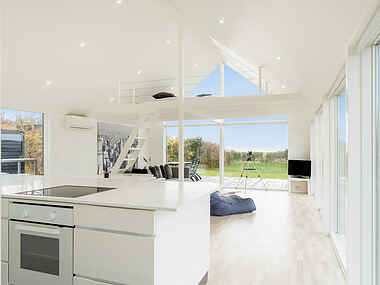 Boligen er på ét plan uden dørtrin og har en enkel og moderne indretning. Der er en hems i stuen, hvor man kan slappe af og nyde udsigten over vandet samt se til Samsø og Helgenæs.